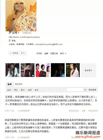 2011年11月28日,罗玉凤在网上表示“我到美国了,我要去找奥巴马了”,并声称“出国就没有打算回去”。而近日,凤姐在其微博上的一句“我要烧了美国移民局”已被美国安全局记录在案,法律程序已经启动,没想到凤姐恐怖言论引火烧身,凤姐或许将面临被收监或者遣返的窘境。之前凤姐在微博说:“高晓松出狱身价陡增?本人我最近人气暴跌,我也要去监狱镀镀金”。难道真的梦想成真了?